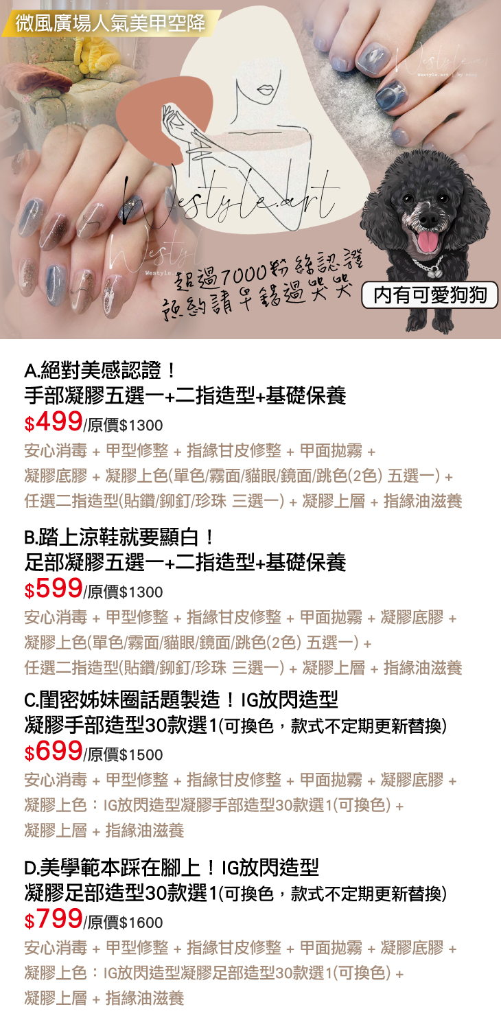 A.絕對美感認證!手部凝膠五選一+二指造型+基礎保養 / B.踏上涼鞋就要顯白!足部凝膠五選一+二指造型+基礎保養 / C.閨密姊妹圈話題製造!IG放閃造型凝膠手部造型30款選1(可換色,款式不定期更新替換) / D.美學範本踩在腳上!IG放閃造型凝膠足部造型30款選1(可換色,款式不定期更新替換)