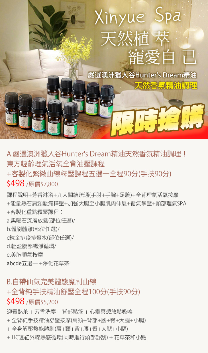 A.嚴選澳洲獵人谷Hunter's Dream精油天然香氛精油調理!東方輕齡理氣活氧全背油壓課程+客製化緊緻曲線釋壓課程五選一全程90分(手技90分)