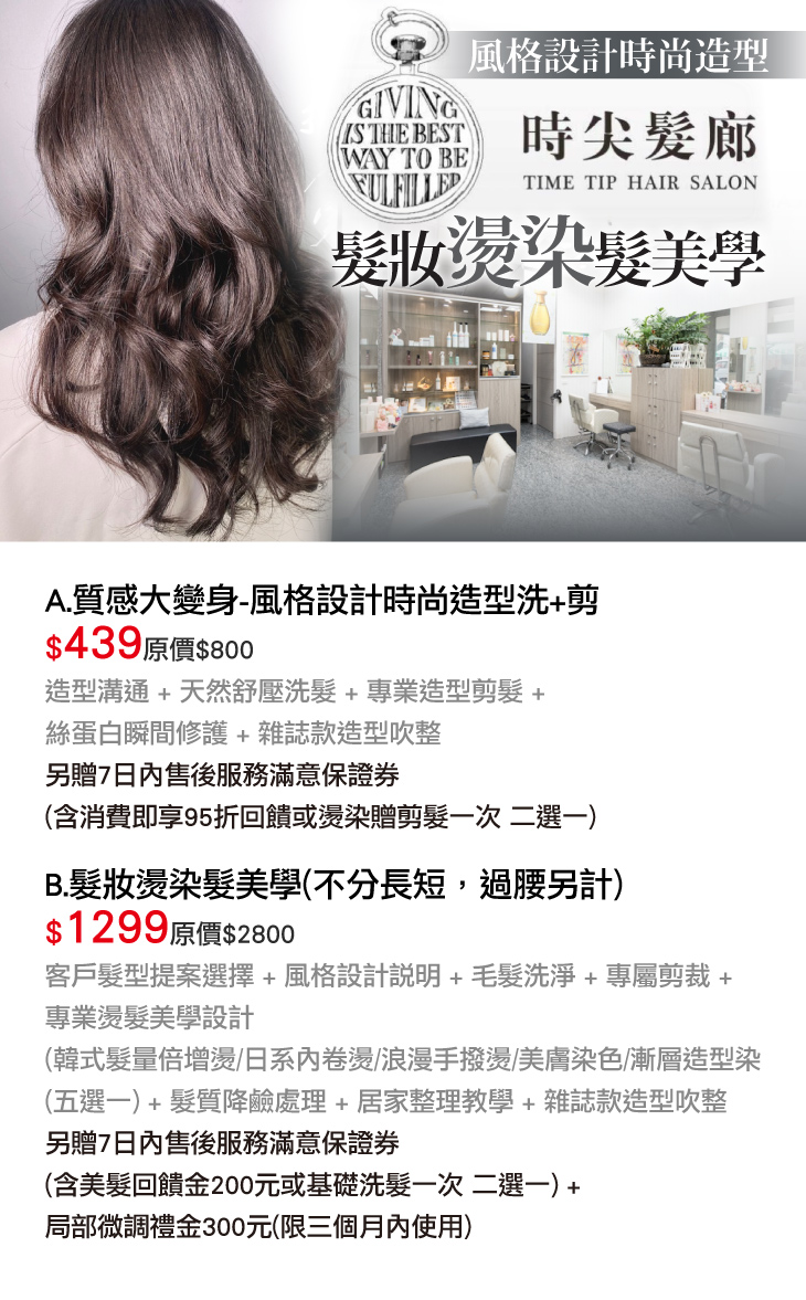 〈造型溝通 + 天然舒壓洗髮 + 專業造型剪髮 + 絲蛋白瞬間修護 + 雜誌款造型吹整〉另贈7日內售後服務滿意保證券(含消費即享95折回饋或燙染贈剪髮一次 二選一)