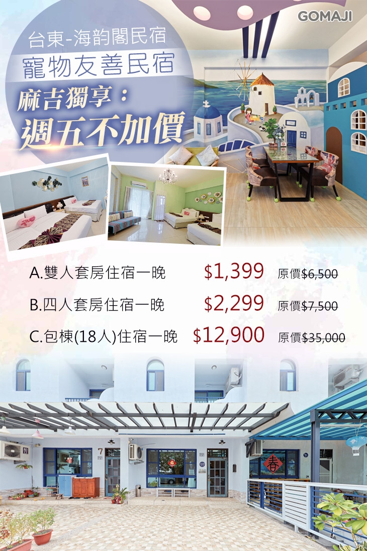 座落於台東知本區的「海韵閣民宿」,是一間溫暖舒適、貼心周到的寵物友善民宿。在這片美麗的淨土,仍保有純真柔美的自然景觀和無拘無束的生活情調,您可於鄉間與花兒共舞、與魚兒悠游、在和煦曠野對山高歌;除了與親友前往,還可以攜帶您的寶貝寵物,快樂地與之共遊,一同在湛藍的晴空下,享受美好、愜意的假期,留下一張張屬於您們的珍貴回憶~