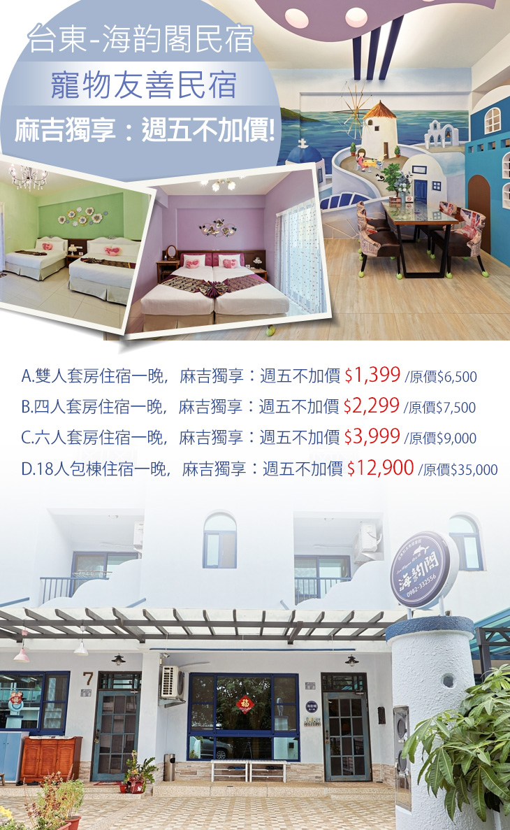 座落於台東知本區的「海韵閣民宿」,是一間溫暖舒適、貼心周到的寵物友善民宿。在這片美麗的淨土,仍保有純真柔美的自然景觀和無拘無束的生活情調,您可於鄉間與花兒共舞、與魚兒悠游、在和煦曠野對山高歌;除了與親友前往,還可以攜帶您的寶貝寵物,快樂地與之共遊,一同在湛藍的晴空下,享受美好、愜意的假期,留下一張張屬於您們的珍貴回憶~