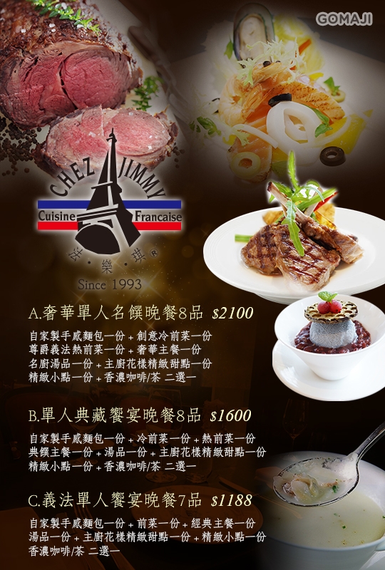 選用每年僅 2% 通過美國農業部認證之 Prime 極佳級純種黑安格斯牛肉,有著如大理石紋路般漂亮得油花分布,肉質細緻柔嫩帶汁,屬珍貴的最高等級牛肉。主廚以多年對美牛的烹調經驗,獨創特殊爐烤法,歷經自然熟成、醃製、按摩、低溫烹調處理,再搭配多種不同風味醬汁。