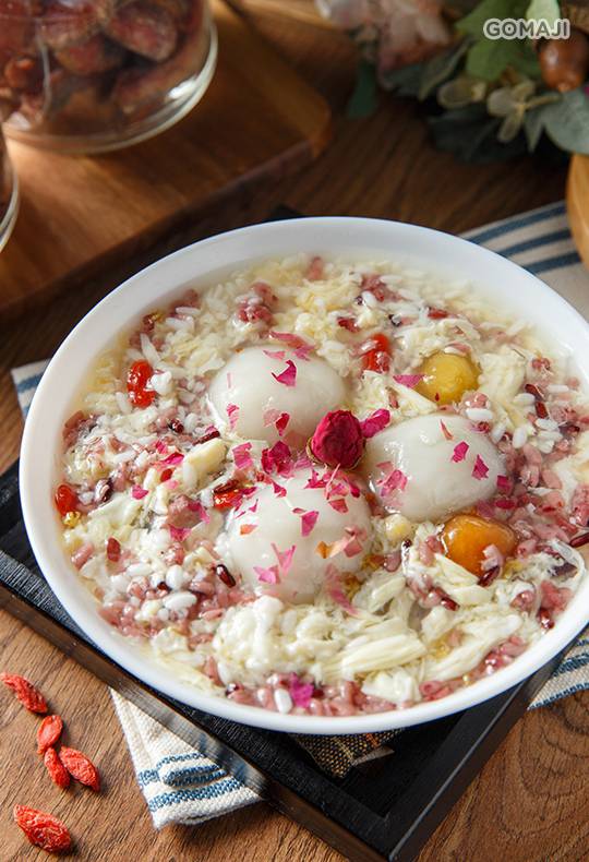 浪漫的玫瑰花瓣撒落在香甜可口的酒釀湯圓上,兼具視覺與味覺的享受,讓麻吉吃的口齒留香,滿足不已。
