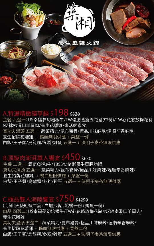 紅潤開胃的辛香麻辣風味,適合重口味的你。欸,那個,不吃辣的你也不用再旁邊碎嘴,〝築湘 養生麻辣火鍋〞打著溫順名號不是叫假的,迷人氣息與溫而不火的口感,旁敲側擊你的味蕾,微麻微辣的吊人胃,真的是好好味!