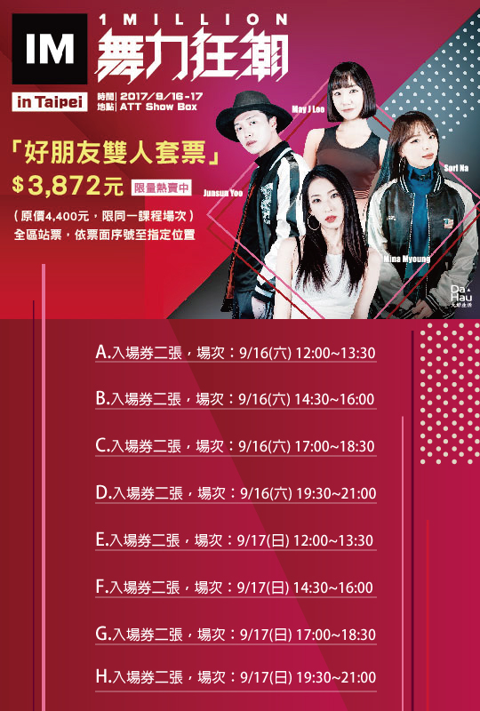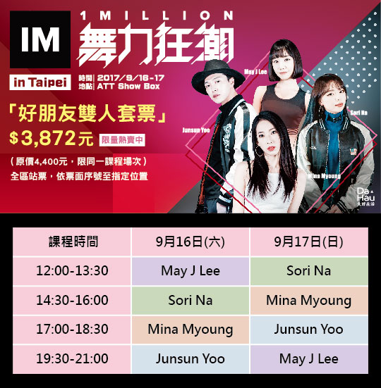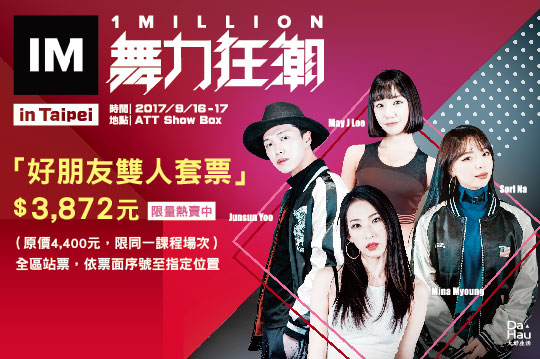 風靡全球、舞蹈魅力影響超過百萬人的韓國編舞天團 1 MILLION Dance Studio,要來台灣啦!長期關注KPOP的韓粉們,應該對 1 MILLION Dance Studio 不陌生吧!本次活動將邀請May J Lee、Mina Myoung、Sori Na、Junsun Yoo 三大女神及男神,強勢襲台!