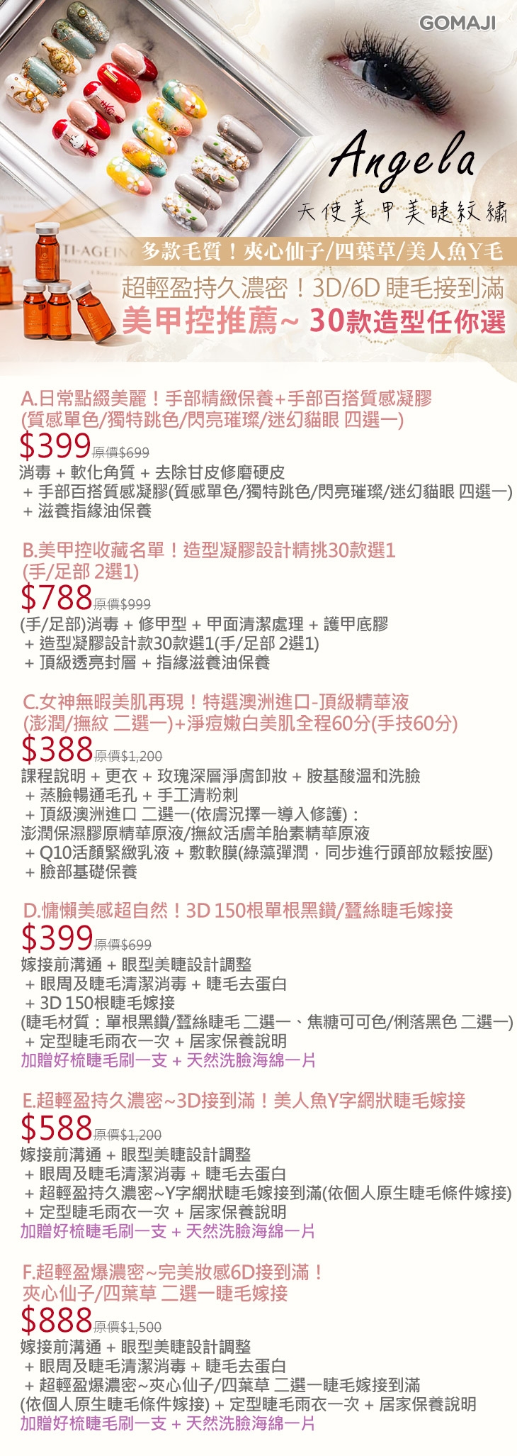 A.日常點綴美麗!手部精緻保養+手部百搭質感凝膠(質感單色/獨特跳色/閃亮璀璨/迷幻貓眼 四選一)/B.造型凝膠設計精挑30款選1(手/足部 2選1)/C.女神無暇美肌再現!特選澳洲進口-頂級精華液(澎潤/撫紋 二選一)+淨痘嫩白美肌全程60分(手技60分)/D.慵懶美感超自然!3D 150根單根黑鑽/蠶絲睫毛嫁接/E.超輕盈持久濃密~3D接到滿!美人魚Y字網狀睫毛嫁接/F.超輕盈爆濃密~完美妝感6D接到滿!夾心仙子/四葉草 二選一睫毛嫁接