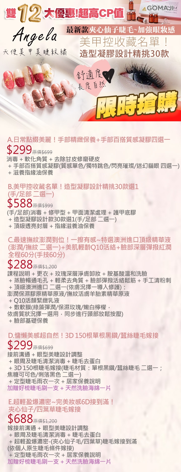 A.日常點綴美麗!手部精緻保養+手部百搭質感凝膠四選一 / B.美甲控收藏名單!造型凝膠設計精挑30款選1(手/足部 二選一) / C.最速撫紋澎潤到位!一擦有感~特選澳洲進口頂級精華液(澎潤/撫紋 二選一)+美肌輕齡Q10活絡+臉部深層彈撥紅潤全程60分(手技60分) / D.慵懶美感超自然!3D 150根單根黑鑽/蠶絲睫毛嫁接 / E.超輕盈爆濃密~完美妝感6D接到滿!夾心仙子/四葉草睫毛嫁接