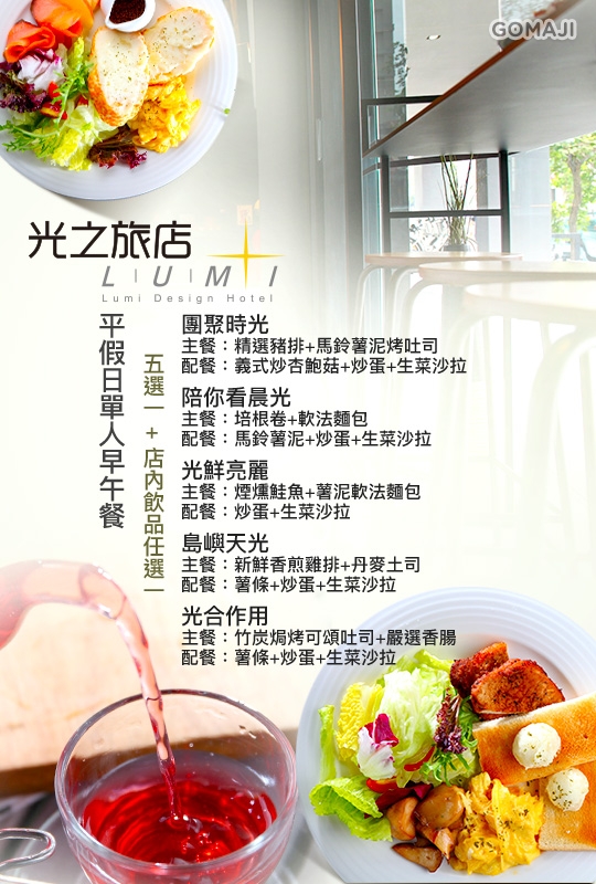 迎接早晨第一道曙光,在輕柔的音樂聲中,空氣中飄散出著濃郁咖啡香,搭配著輕食,用活力早餐點亮元氣的一天,在喧囂的街道城市中給予心靈休憩的空間,品味美食的細緻、享用料理的情調內涵,彷彿置身於巴黎街頭,欣賞 LUMI 的光影對話。