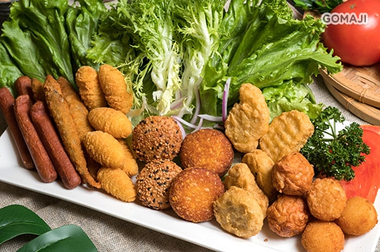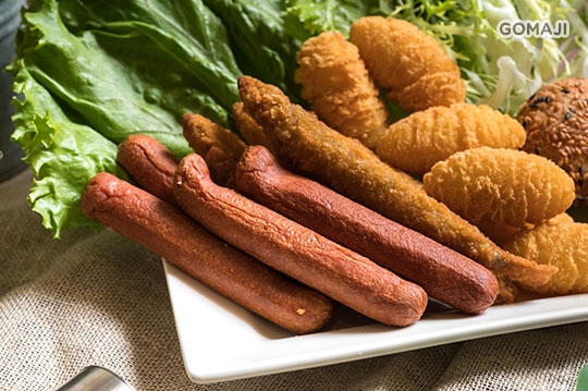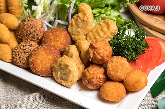 紅豆芝麻球二顆 + 柳葉魚三條 + 花枝丸三顆 + 起司薯球四顆 + 南瓜奶皇酥二顆 + 逗逗薯球六顆 + 麥克雞塊五個 + 熱狗四支