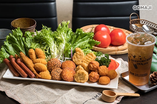 檸檬雞柳三條 + 花枝甜不辣五個 + 小肉豆一份 + 黃金 QQ 棒三支 + 洋蔥圈五個 + 蛋黃芋球三顆 + 玉米奶酥三個