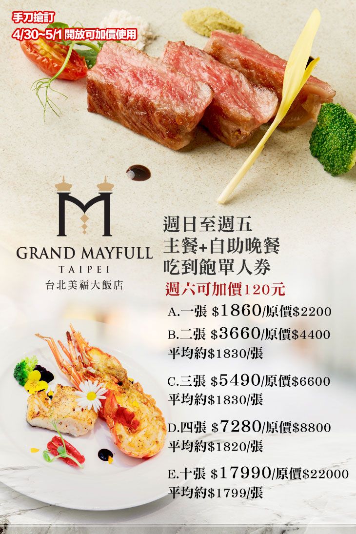 卓越五星,週日至週五主餐+自助晚餐吃到飽單人券(週六及04/30~05/01可加價120元;部分日期除外,詳細以券面/飯店為主)