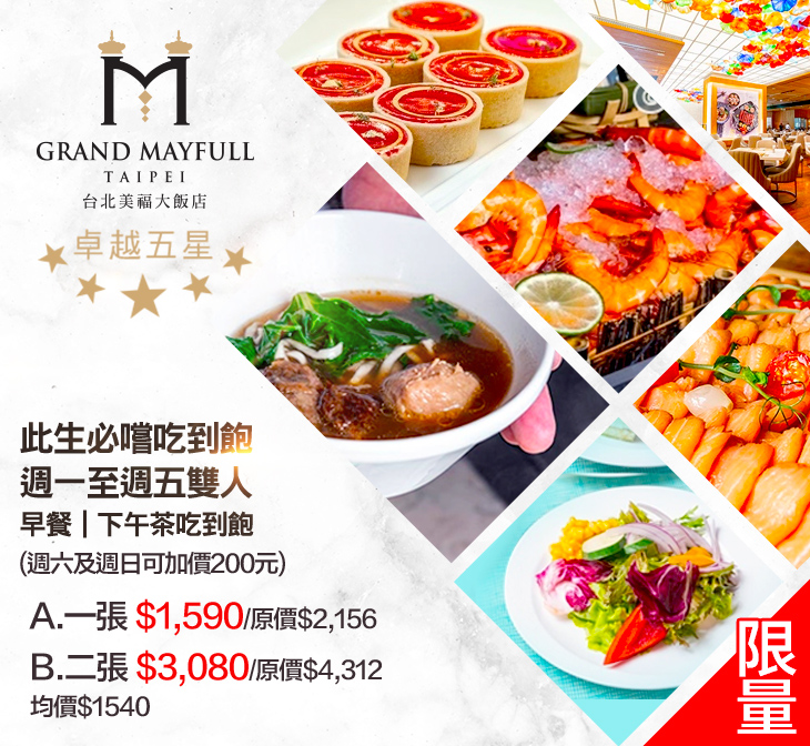 週一至週五雙人(早餐/下午茶)自助吃到飽(週六及週日可加價200元)