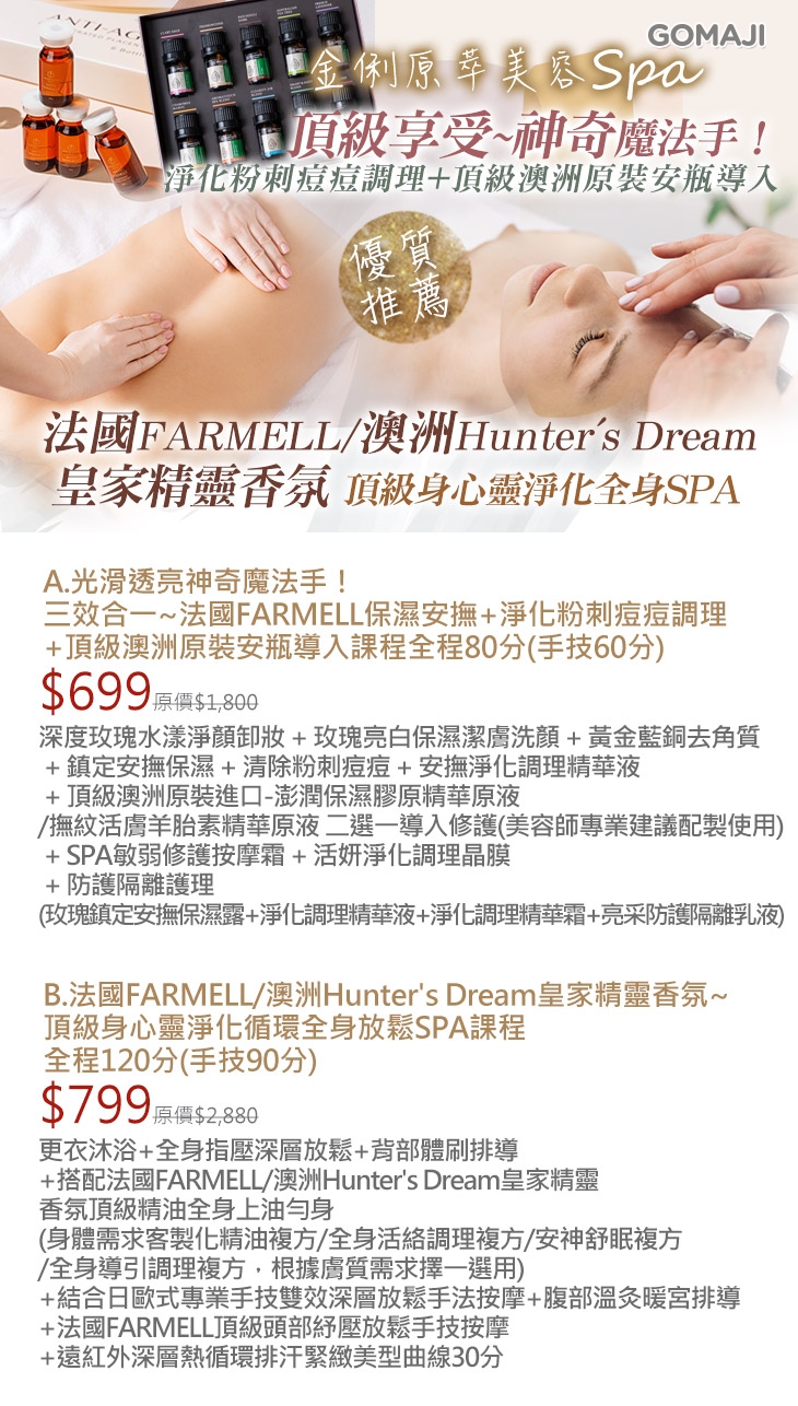 A.光滑透亮神奇魔法手!三效合一~法國FARMELL保濕安撫+淨化粉刺痘痘調理+頂級澳洲原裝安瓶導入課程全程80分(手技60分) / B.法國FARMELL/澳洲Hunter's Dream皇家精靈香氛~頂級身心靈淨化循環全身放鬆SPA課程全程120分(手技90分)