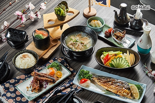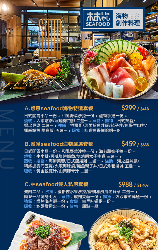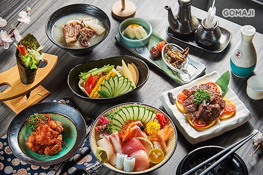日式開胃小品一份 + 和風野菜沙拉一份 + 海老蘆筍手捲一份 + 燒物:牛小排/挪威塩烤鯖魚/塩烤明太子中卷 三選一 + 蒸物、揚物:海鮮芙蓉/日式唐揚雞 二選一 + 強餚:海之盛丼飯/精緻握壽司五貫/火取海味燒/鮭魚親子丼/日式炸豬排丼 五選一 + 吸物:黃金蜆蒜汁/山藥豚骨汁 二選一