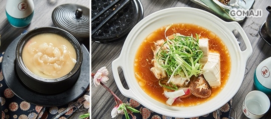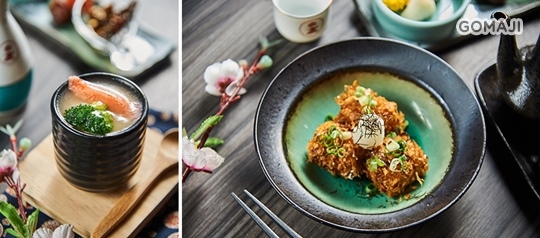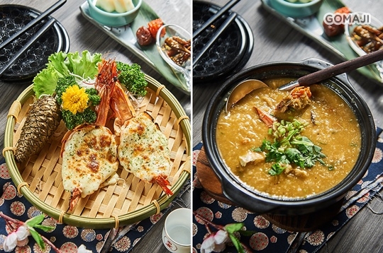 先附二品 + 沙拉:優格佐水果沙拉/香柚和風海老野菜 二選一 + 時令一品刺身七入 + 蒸物:展翅芙蓉一份 + 鮮魚:火取季節鮮魚一份 + 強餚:焗烤海老蝦一份 + 食事:古早味蟳粥一份 + 吸物:鮑翅燉雞盅一份 + 甘物:甜點一品