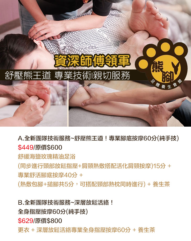 A.全新團隊技術服務~舒壓熊王道!專業腳底按摩60分(純手技) / B.全新團隊技術服務~深層放鬆活絡!全身指壓按摩60分(純手技)