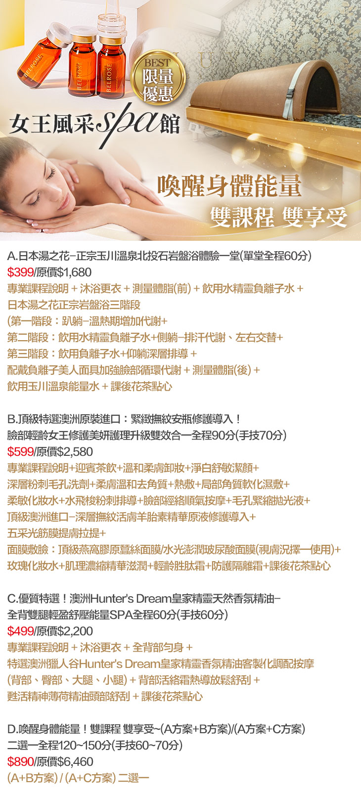 A.日本湯之花-正宗玉川溫泉北投石岩盤浴體驗一堂(單堂全程60分) / B.頂級特選澳洲原裝進口:緊緻撫紋安瓶修護導入!臉部輕齡女王修護美妍護理升級雙效合一全程90分(手技70分) / C.優質特選!澳洲Hunter's Dream皇家精靈天然香氛精油-全背雙腿輕盈舒壓能量SPA全程60分(手技60分) / D.喚醒身體能量!雙課程 雙享受~(A方案+B方案)/(A方案+C方案) 二選一全程120~150分(手技60~70分)