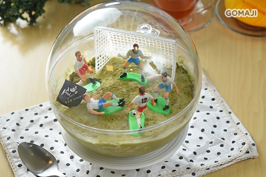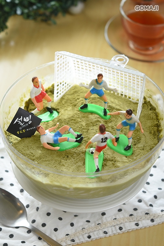 宇治金時抹茶口味內餡有一層入口即化奶酪,再加上熬煮至綿密鬆軟的萬丹的紅豆,最後再淋上一層濃濃的抹茶醬,足足有10寸蛋糕這麼大,足夠兩三個人吃喔,喜歡世足冰友們可別錯過!