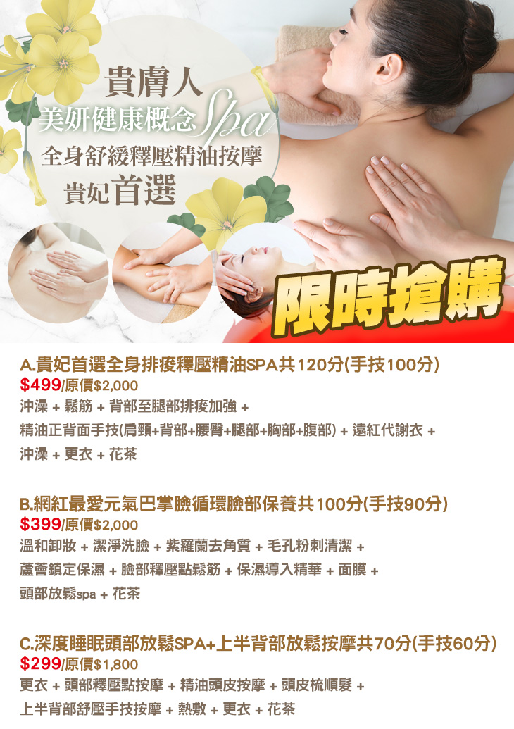 A.貴妃首選全身排痠釋壓精油SPA共120分(手技100分) / B.網紅最愛元氣巴掌臉循環臉部保養共100分(手技90分) / C.深度睡眠頭部放鬆SPA+上半背部放鬆按摩共70分(手技60分)