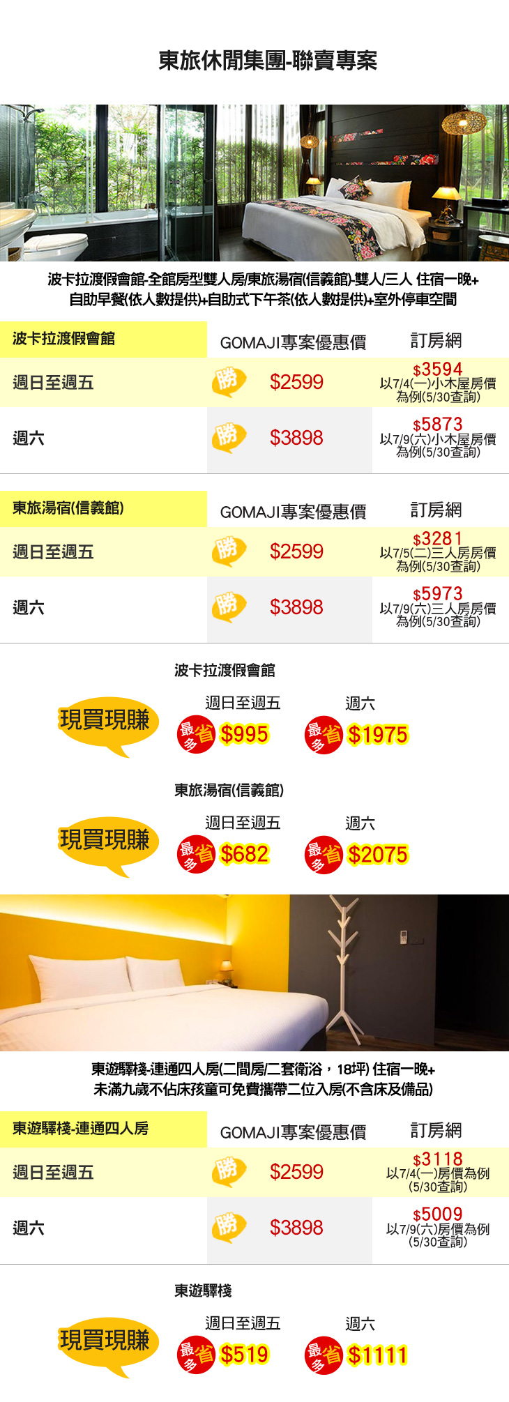 ★ GOMAJI下單,再附自助早餐、自助式下午茶(限波卡拉&東旅湯宿信義館),讓您的假期更完美!