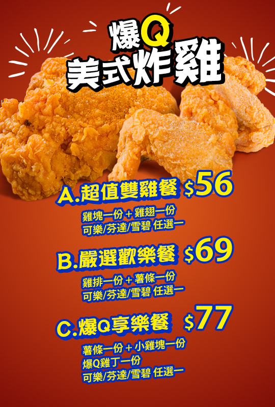 C.爆Q享樂餐:薯條一份 + 小雞塊一份 + 爆Q雞丁一份 + 可樂/芬達/雪碧 任選一