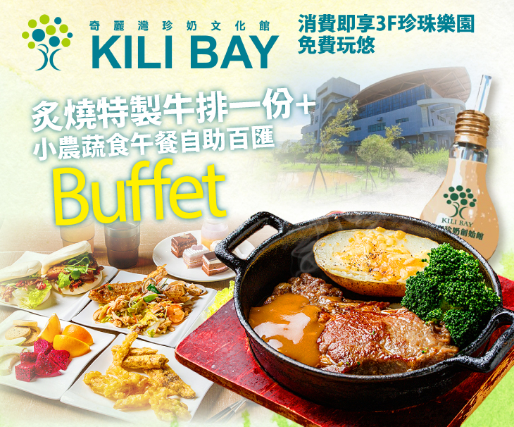 ★麻吉提醒:因應疫情影響,自助百匯無法正常供應,即日起改為套餐(炙燒特製牛排一份 + 兩品小菜一份 + 酥皮濃湯一份 + 燈泡珍珠奶茶一杯 + 甜點:蛋糕/布丁 二選一),另加贈奇麗灣世界奶茶系列一盒(口味隨機)(價值299元)