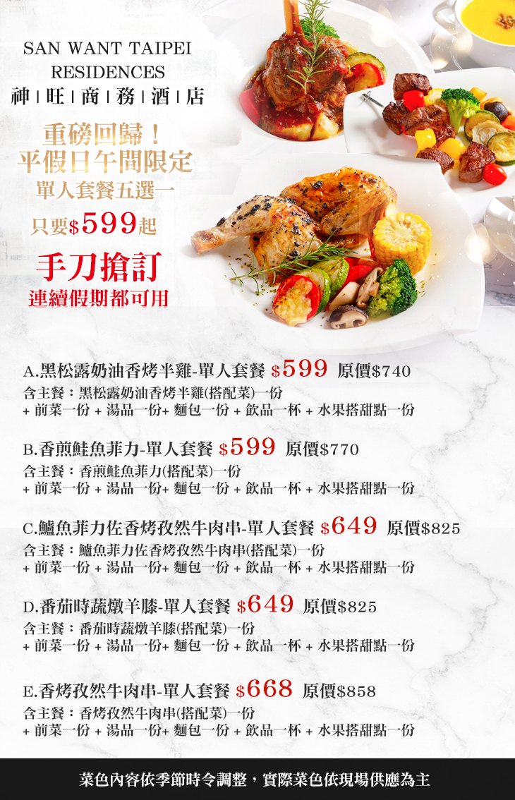 平假日午間限定!A.黑松露奶油香烤半雞-單人套餐 / B.香煎鮭魚菲力-單人套餐 / C.鱸魚菲力佐香烤孜然牛肉串-單人套餐 / D.番茄時蔬燉羊膝-單人套餐 / E.香烤孜然牛肉串-單人套餐
