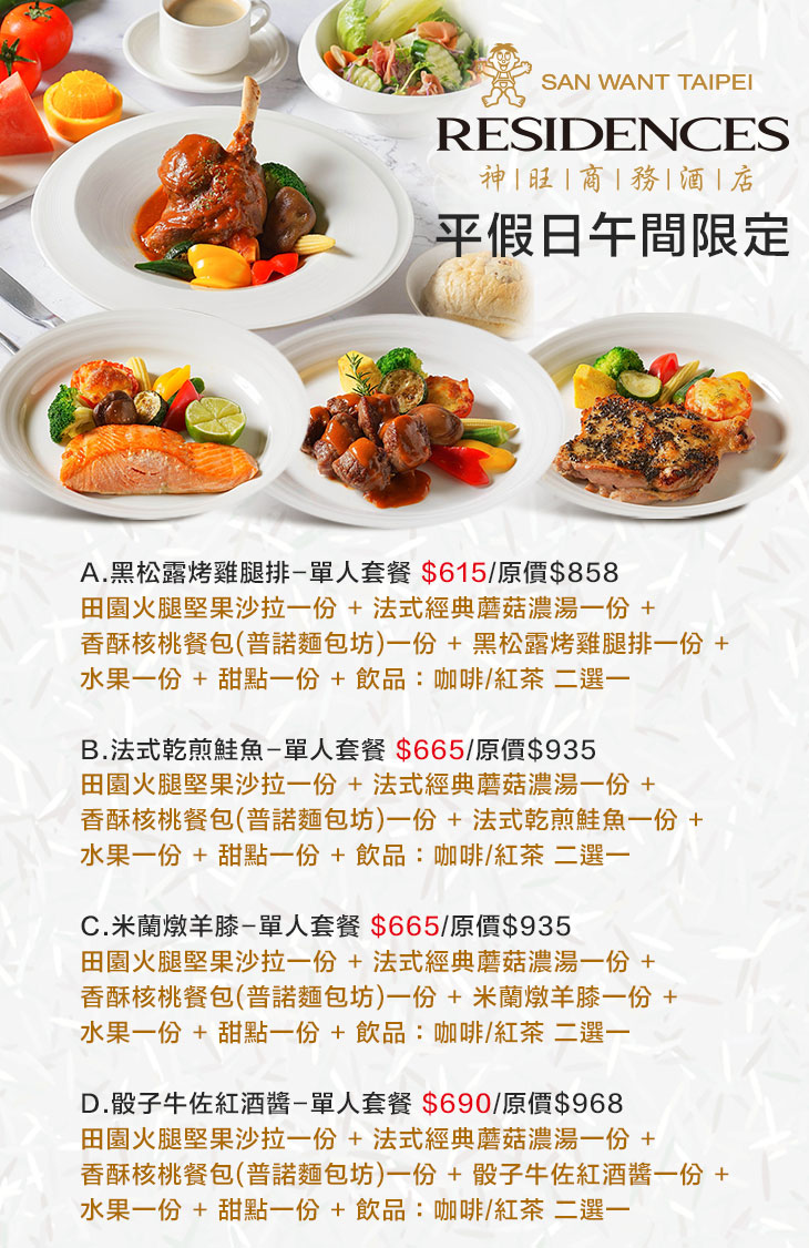 平假日午間限定!A.黑松露烤雞腿排-單人套餐 / B.法式乾煎鮭魚-單人套餐 / C.米蘭燉羊膝-單人套餐 / D.骰子牛佐紅酒醬-單人套餐