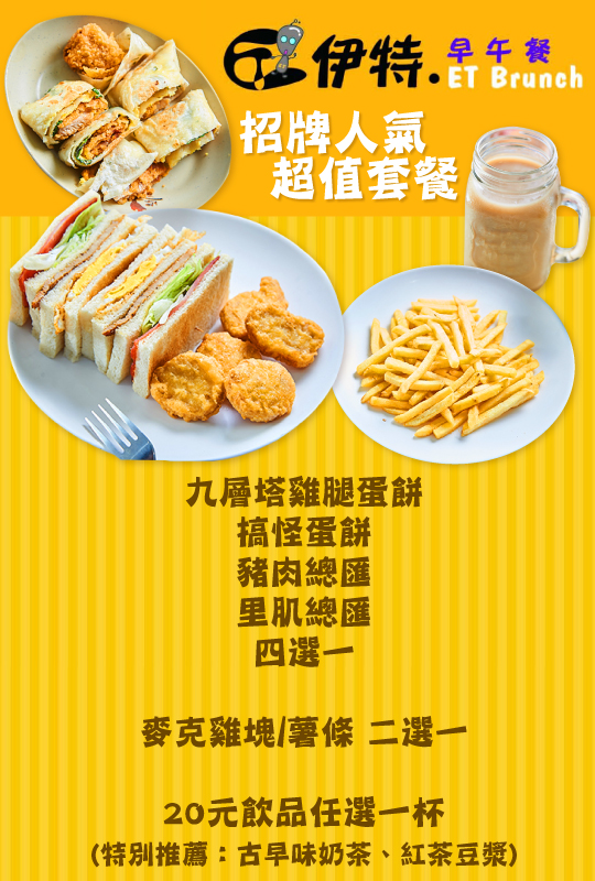 【伊特早午餐】 位於高雄市鼓山區華榮路 360 號的伊特早午餐,專營新鮮美味的早午餐,小小的空間營造出大大的幸福感,豬肉總匯、里肌總匯等每一樣都好好吃啊! 【招牌人氣超值套餐】 九層塔雞腿蛋餅 香噴噴的九層塔,搭配軟嫩酥脆的新鮮雞腿肉,包在蛋餅裡,多麼地好吃啊!超級滿足! 搞怪蛋餅 里肌總匯 層層堆疊味蕾之上的里肌總匯,相當有飽足感! 麥克雞塊 薯條 20元飲品任選一杯:古早味奶茶