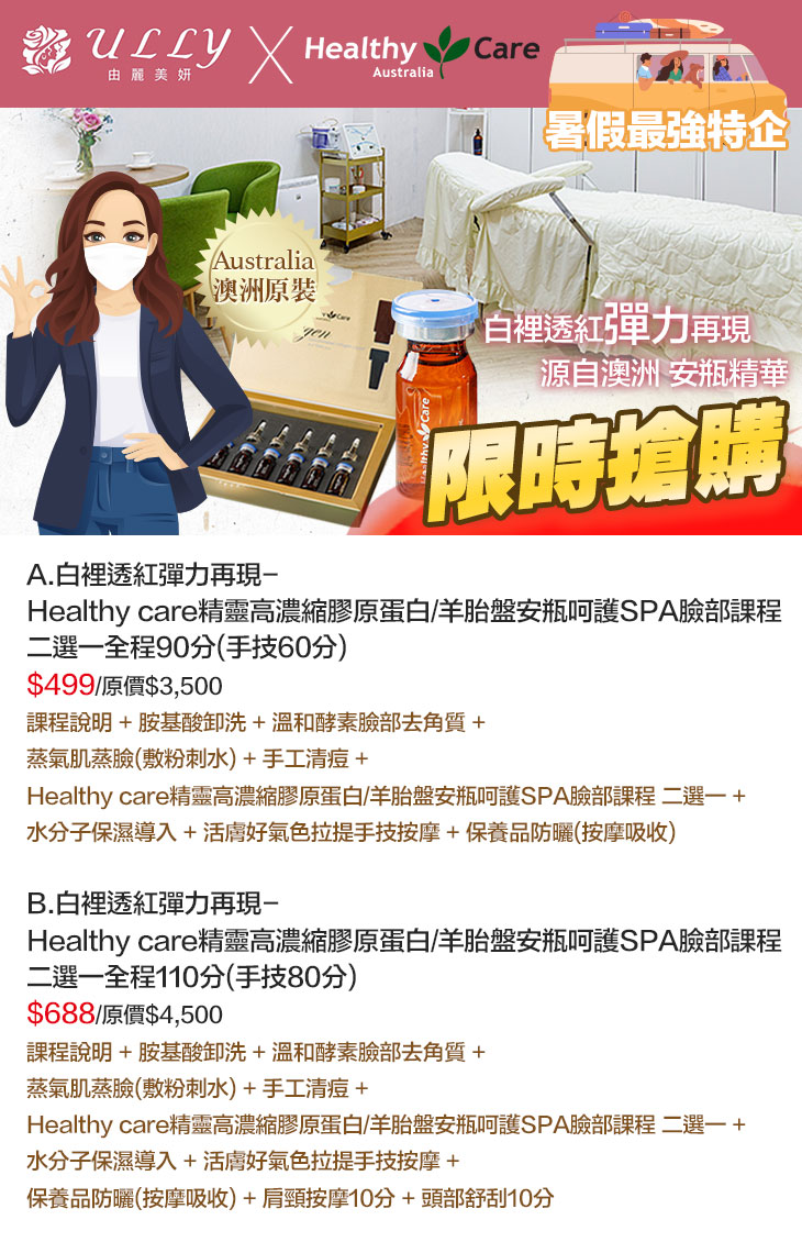 A.白裡透紅彈力再現-Healthy care精靈高濃縮膠原蛋白/羊胎盤安瓶呵護SPA臉部課程 二選一全程90分(手技60分)