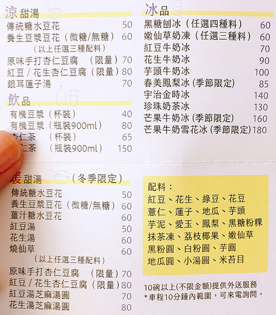 特別推薦:傳統糖水豆花、原味手打杏仁豆腐、銀耳蓮子湯、杏仁茶、燒仙草、紅豆湯芝麻湯圓、黑糖刨冰、宇治金時冰