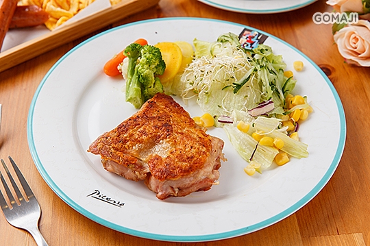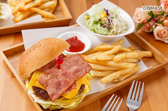 層層堆疊出來的好滋味!鮮嫩肉排加上培根和起司、搭配金黃脆薯和清爽的沙拉,輕鹹順口入味好食,各種食材顯盡多種風采,美味呈現!