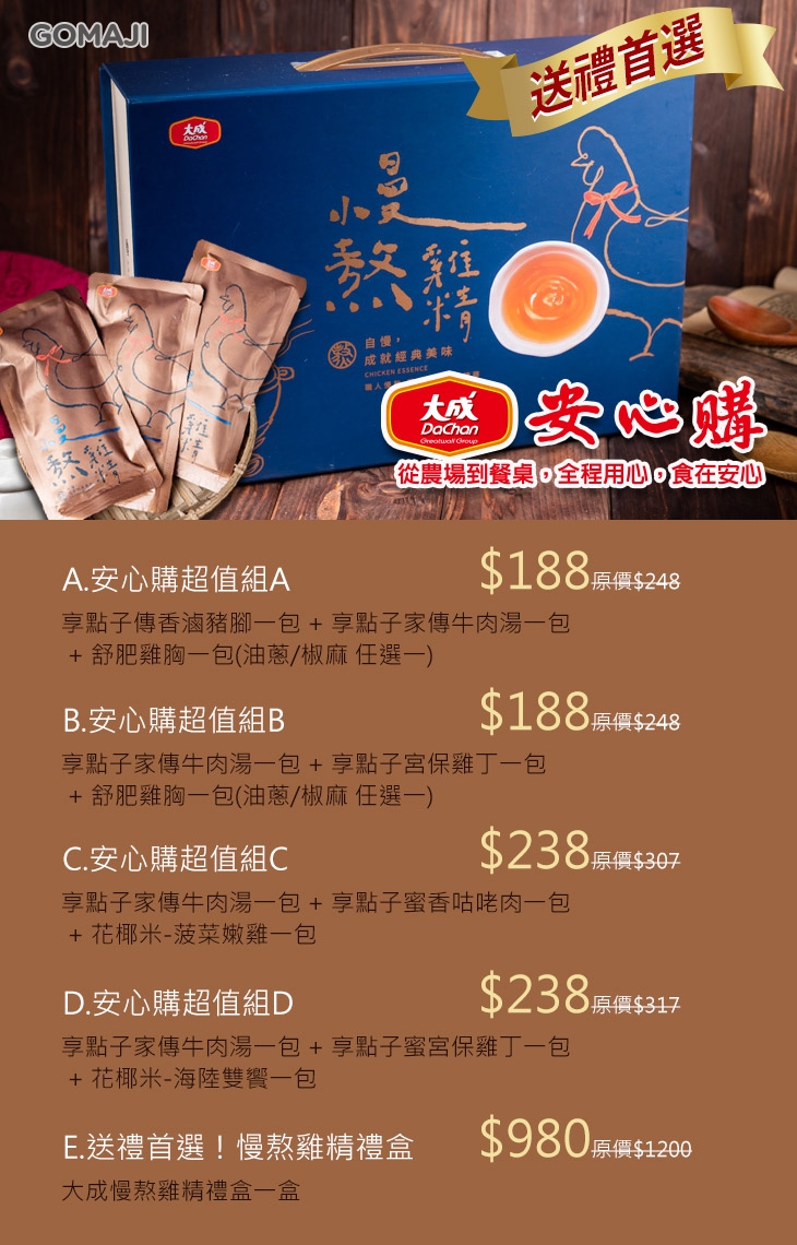 為消費者溝通食材及料理的平台,傳達食品安全理念,這是【安心購】的主要訴求!以大成旗下商品為核心,安心雞、鹿野土雞、大成蛋品、根島生態蝦、桐德黑豚及杜洛克紅豬,以及沙拉油、調理食品等,再拓及多元產地、高檔、進口的牛肉商品。以食材專賣店的定位來鎖定目標客群,再結合針對現今市場行銷營運導向多元、靈敏的洞察性,將調理食品的類別擴增,增加許多單人包或小份量的包裝,透過精進、創新,穩定塑造自家品牌特性與服務特色。過程中也追求品質、講究服務,並以「安心無添加」為目標訴求,進而打造一系列優質、健康的食品,將食安的精神不僅落實在品牌、更落實在每樣商品中。