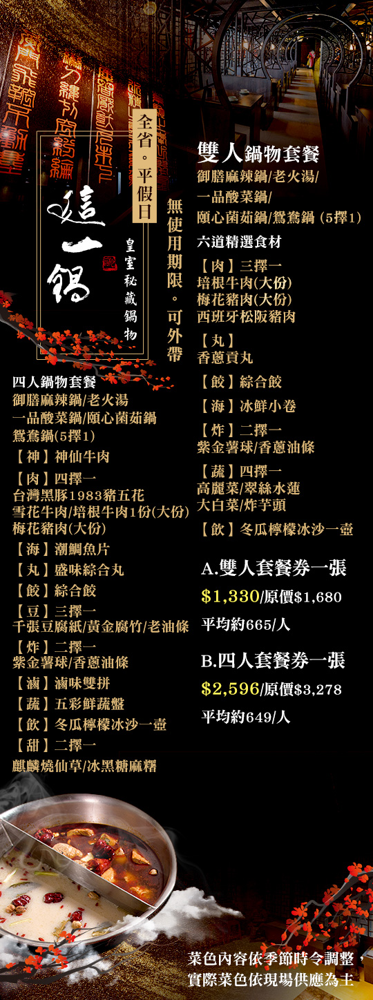 適用時間、地點:依各分店營業時間及地址,請參考:這一鍋官網