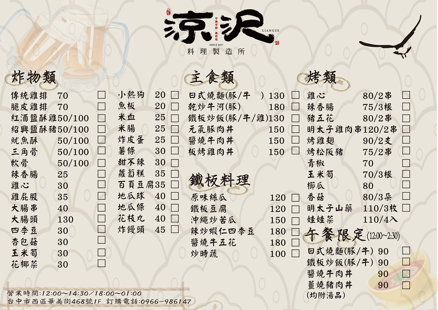 位於台中市西區華美街 468 號的涼沢日式炒麵 / 台式炸物料理製造所,鄰近廣三sogo,專營日式料理,環境簡約,料豐味美,樣樣皆是老闆得意之作,本次推出折抵優惠,要搶要快,機會難得。