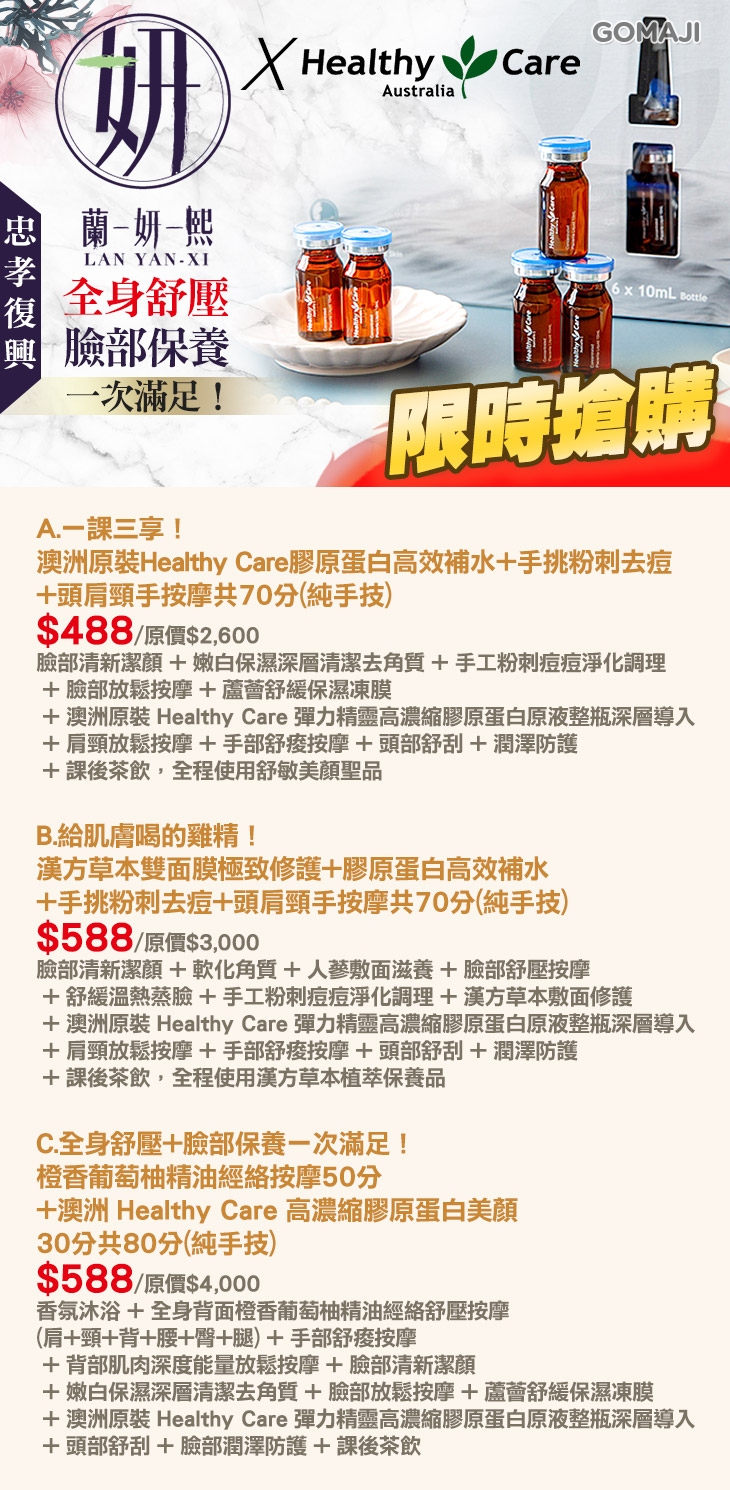 A.一課三享!澳洲原裝Healthy Care膠原蛋白高效補水+手挑粉刺去痘+頭肩頸手按摩共70分(純手技) / B.給肌膚喝的雞精!漢方草本雙面膜極致修護+膠原蛋白高效補水+手挑粉刺去痘+頭肩頸手按摩共70分(純手技) / C.全身舒壓+臉部保養一次滿足!橙香葡萄柚精油經絡按摩50分+澳洲Healthy Care高濃縮膠原蛋白美顏30分共80分(純手技)