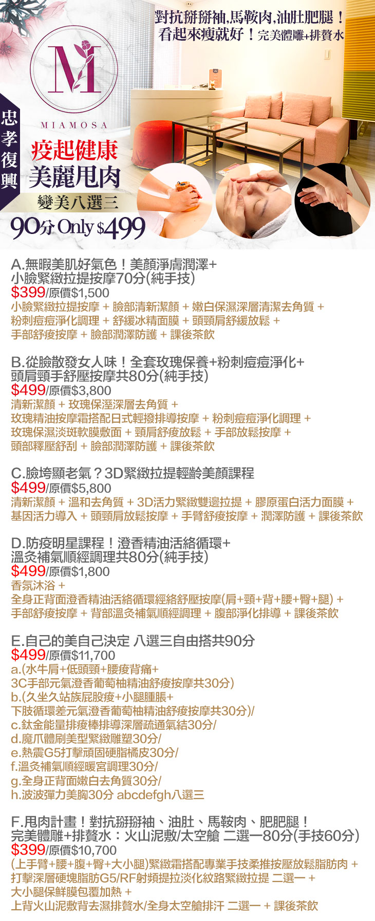 A.無暇美肌好氣色!美顏淨膚潤澤+小臉緊緻拉提按摩70分(純手技) / B.從臉散發女人味!全套玫瑰保養+粉刺痘痘淨化+頭肩頸手舒壓按摩共80分(純手技) / C.臉垮顯老氣?3D緊緻拉提輕齡美顏課程 / D.防疫明星課程!澄香精油活絡循環+溫灸補氣順經調理共80分(純手技) / E.自己的美自己決定 八選三自由搭共90分 / F.甩肉計畫!對抗掰掰袖、油肚、馬鞍肉、肥肥腿!完美體雕+排贅水:火山泥敷/太空艙 二選一80分(手技60分)