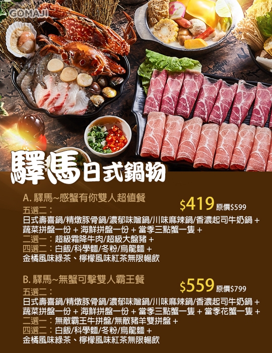 近捷運後驛站、後火車站!天氣漸漸轉涼,當然少不了暖呼呼的鍋物相伴!寬敞的空間搭配柔和燈光襯托出舒適氛圍,在這裡享用迷人鍋物再適合不過!嚴選新鮮肉品與海鮮,搭配特製的溫潤湯頭,還有各種食材,給您最豐盛的鍋物饗宴!優惠好康不要錯過,驛馬日式鍋物絕對是您省荷包、嚐美味的首選!