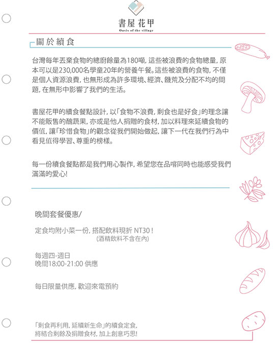 全台第一家續食餐廳 ~ 以愛堆砌而成〝書屋花甲〞早已聞名南機場社區的大街小巷,成立宗旨為運用即將被浪費的食材,重新作為料理端上餐桌,提供長者與社區居民豐富的一餐。目前餐廳已開設一年多,默默持續耕耘,為需要更多幫助的人盡一分心力。