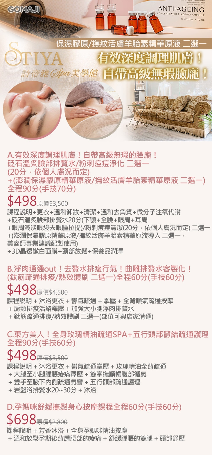 A.有效深度調理肌膚!自帶高級無瑕的臉龐!砭石溫炙臉部排贅水/粉刺痘痘淨化 二選一(20分,依個人膚況而定)+(澎潤保濕膠原精華原液/撫紋活膚羊胎素精華原液 二選一)全程90分(手技70分) / B.浮肉通通out!去贅水排痠行氣!曲雕排贅水客製化!(鈦筋疏通排痠/熱效體刷 二選一)全程60分(手技60分) / C.東方美人!全身玫瑰精油疏通SPA+五行頭部鬱結疏通護理全程90分(手技60分) / D.孕媽咪舒緩撫慰身心按摩課程全程60分(手技60分)