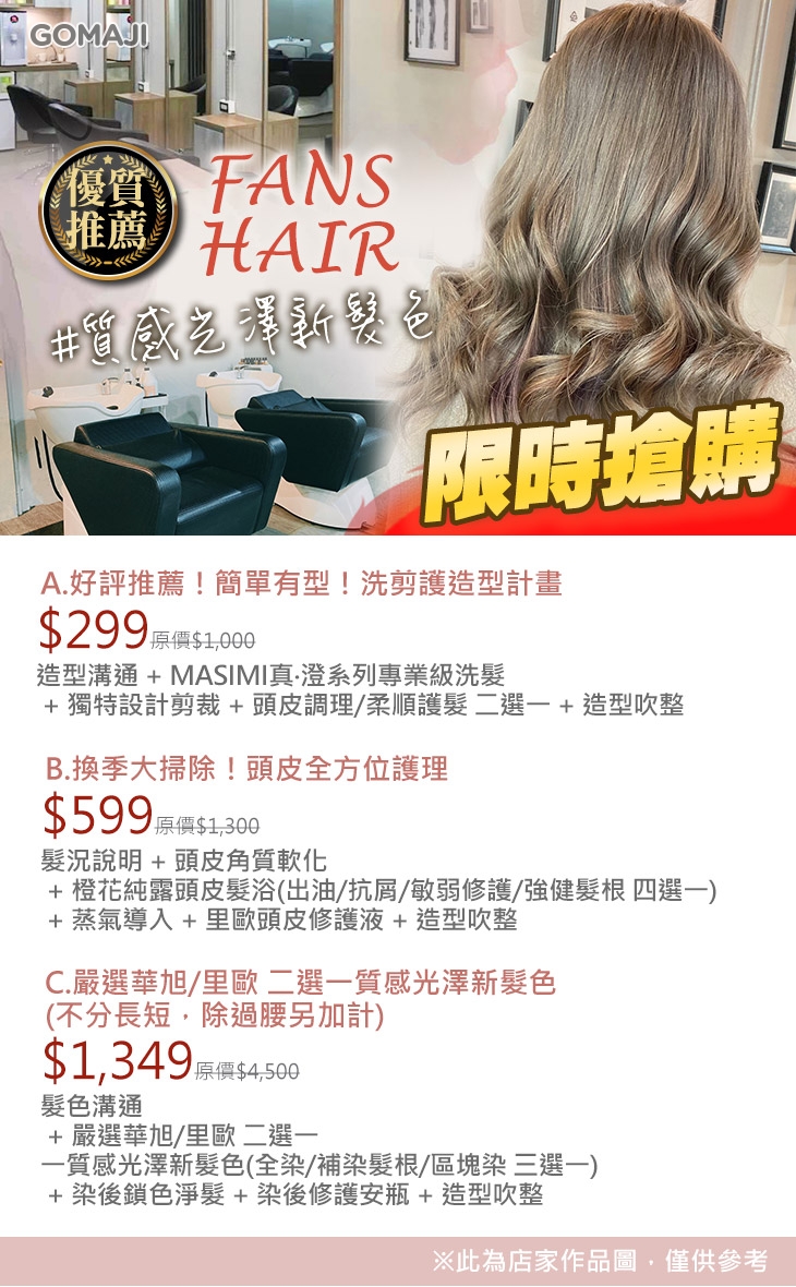 A.好評推薦!簡單有型!洗剪護造型計畫 / B.換季大掃除!頭皮全方位護理 / C.嚴選華旭/里歐 二選一質感光澤新髮色(不分長短,除過腰另加計)