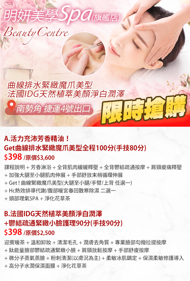 A.活力充沛芳香精油!Get曲線排水緊緻魔爪美型全程100分(手技80分) / B.法國IDG天然植萃美顏淨白潤澤+鬱結疏通緊緻小臉護理90分(手技90分)