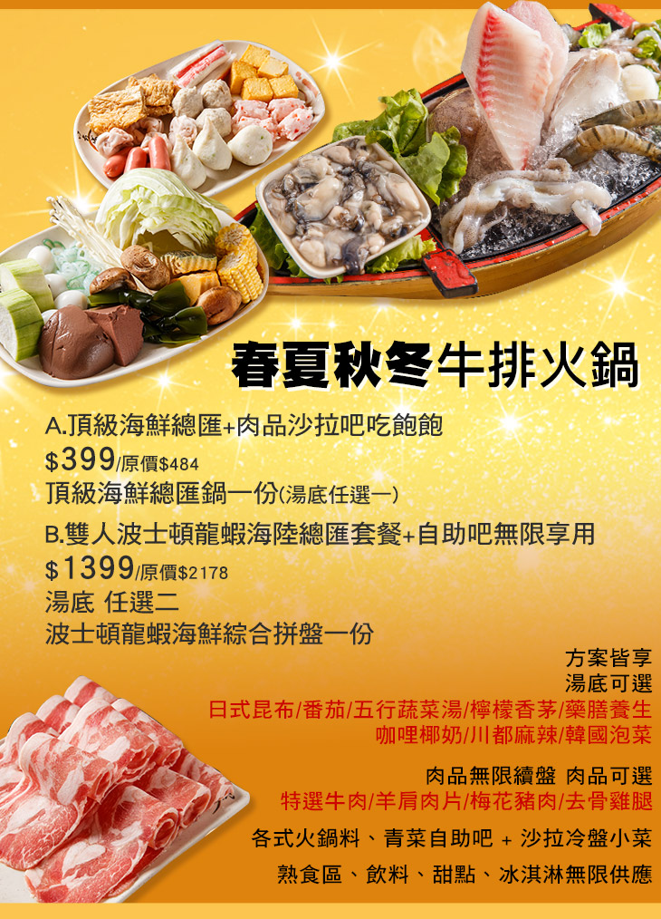 湯底:日式昆布/番茄/五行蔬菜湯/檸檬香茅/藥膳養生/咖哩椰奶/川都麻辣/韓國泡菜 任選二 + 波士頓龍蝦海鮮綜合拼盤一份 + 肉品無限續盤(可選:松阪豬/特選牛肉/羊肩肉片/梅花豬肉/去骨雞腿) + 各式火鍋料、青菜自助吧、沙拉冷盤小菜、熟食區、飲料、甜點、冰淇淋無限供應