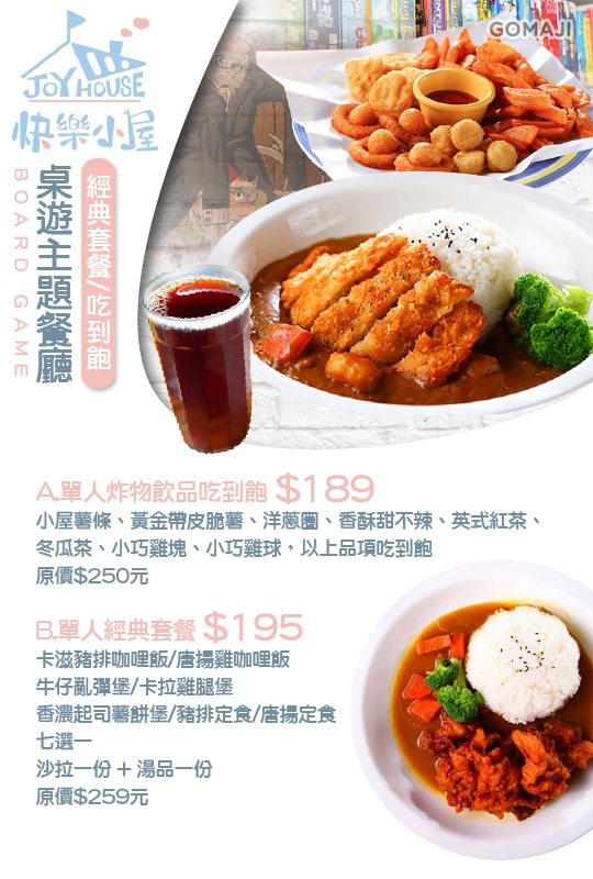 你,也犯了文明病嗎?沒有 3C 活不下去。〝快樂小屋桌上遊戲主題餐廳〞幫助你,我,重新找回自己。拉近人與人之間的距離,有豐富多樣的類型遊戲,無論是明爭暗鬥、鬥智聯盟、亦或是比創意、搞想像力,這裡的遊戲一應俱全。此外,還提供美味的精緻餐點,唐揚雞咖哩飯、炸物,樣樣經典。