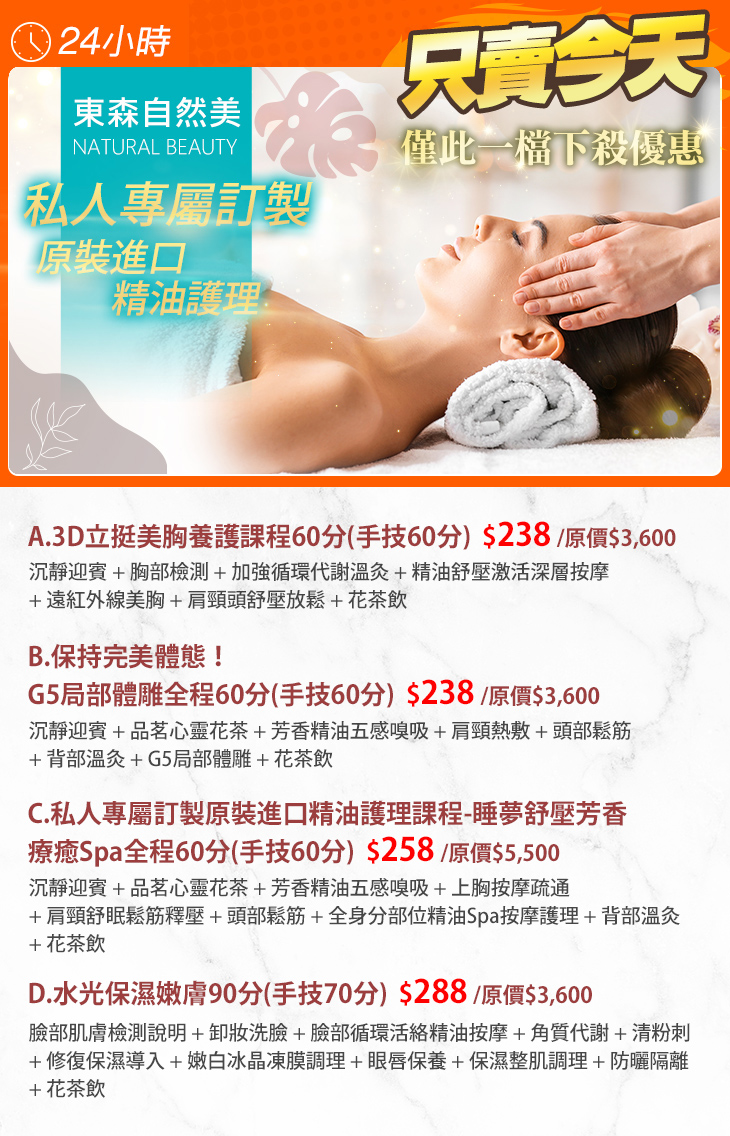 A.3D立挺美胸養護課程60分(手技60分) / B.保持完美體態!G5局部體雕全程60分(手技60分) / C.私人專屬訂製原裝進口精油護理課程-睡夢舒壓芳香療癒Spa全程60分(手技60分) / D.水光保濕嫩膚90分(手技70分)