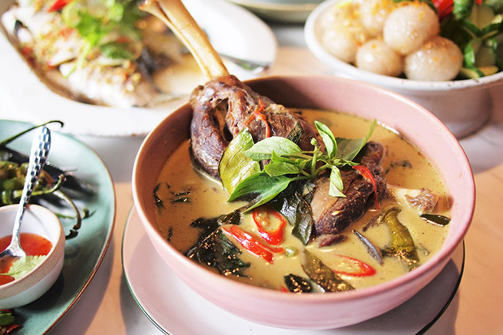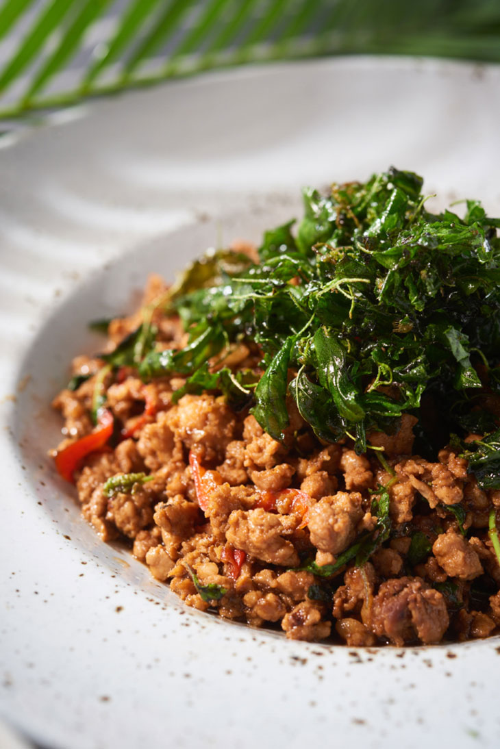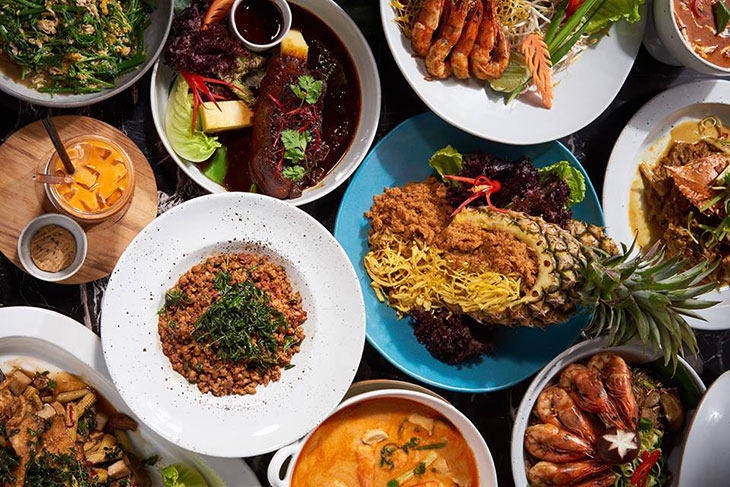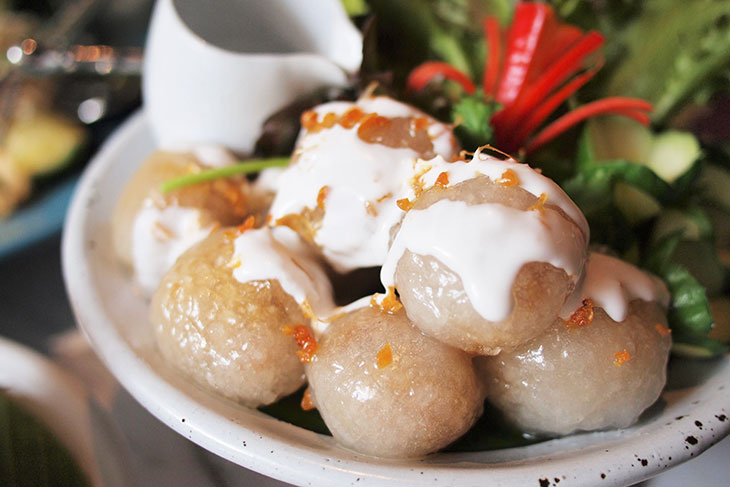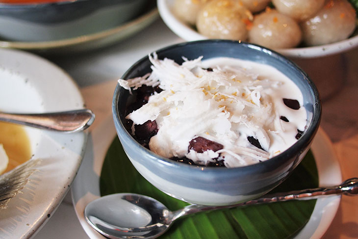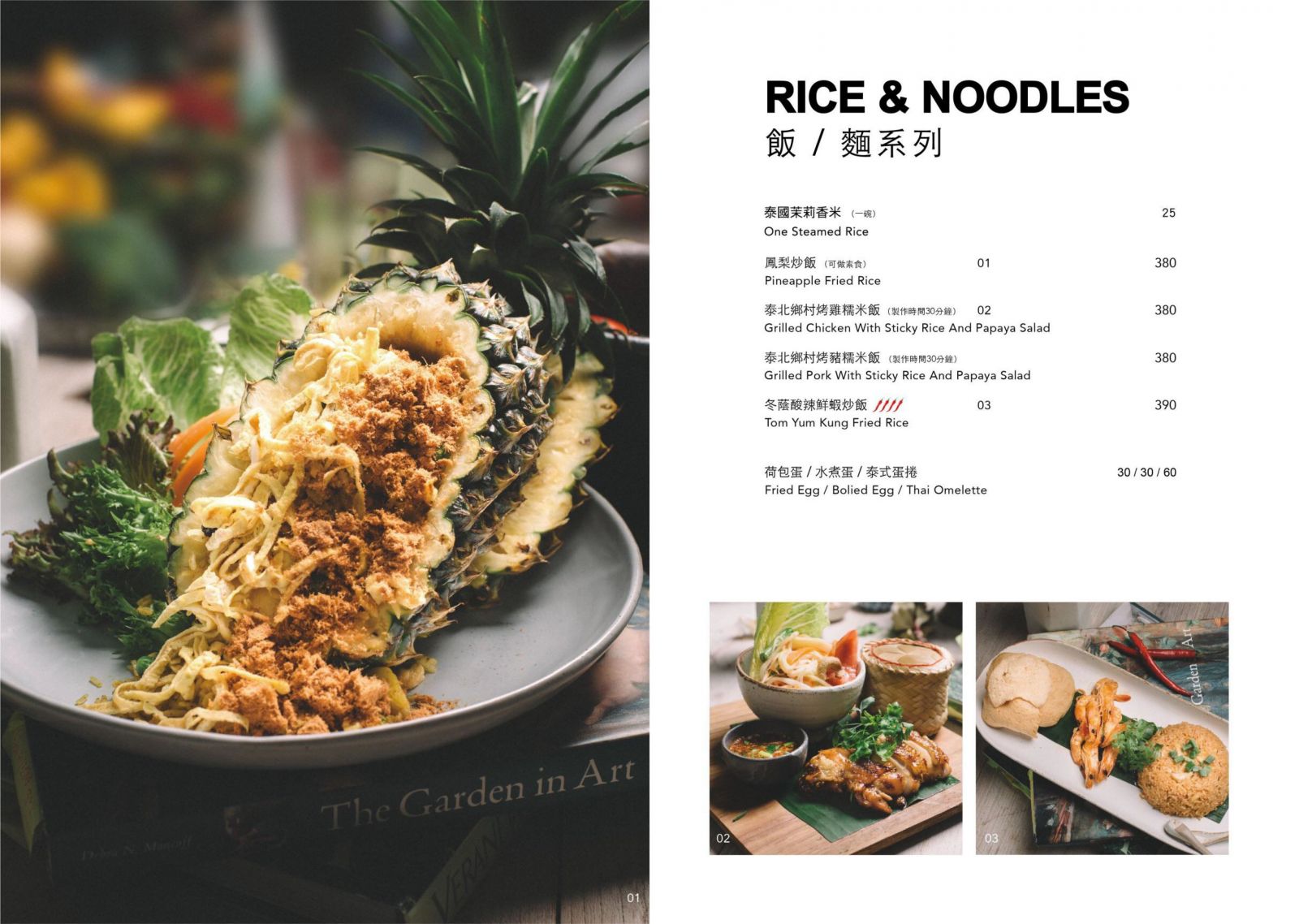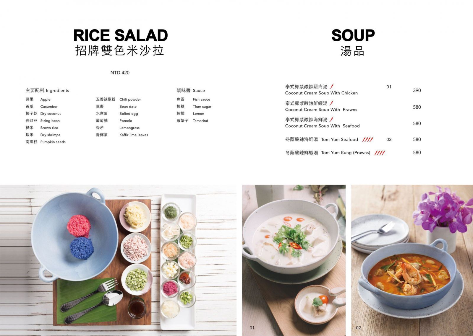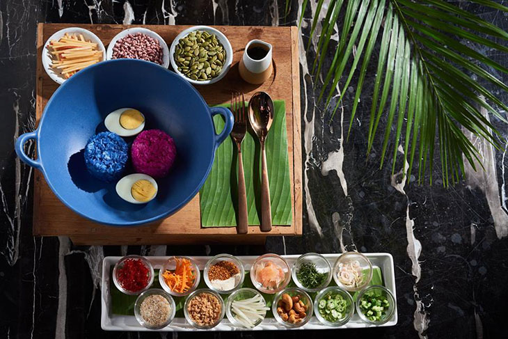 以蝶豆花和紅龍果自然原色製作成的雙色米,加入蘋果、椰子酥、 糙米、南瓜籽等多達 15 種配料淋上特製魚露醬拌勻後品嚐, 口感層次豐富,是來店絕對不可錯過的特色好菜。