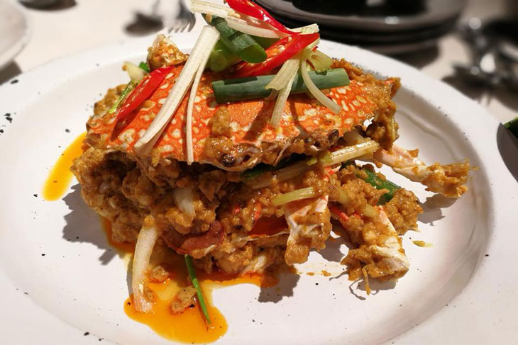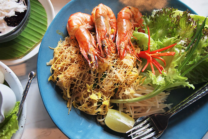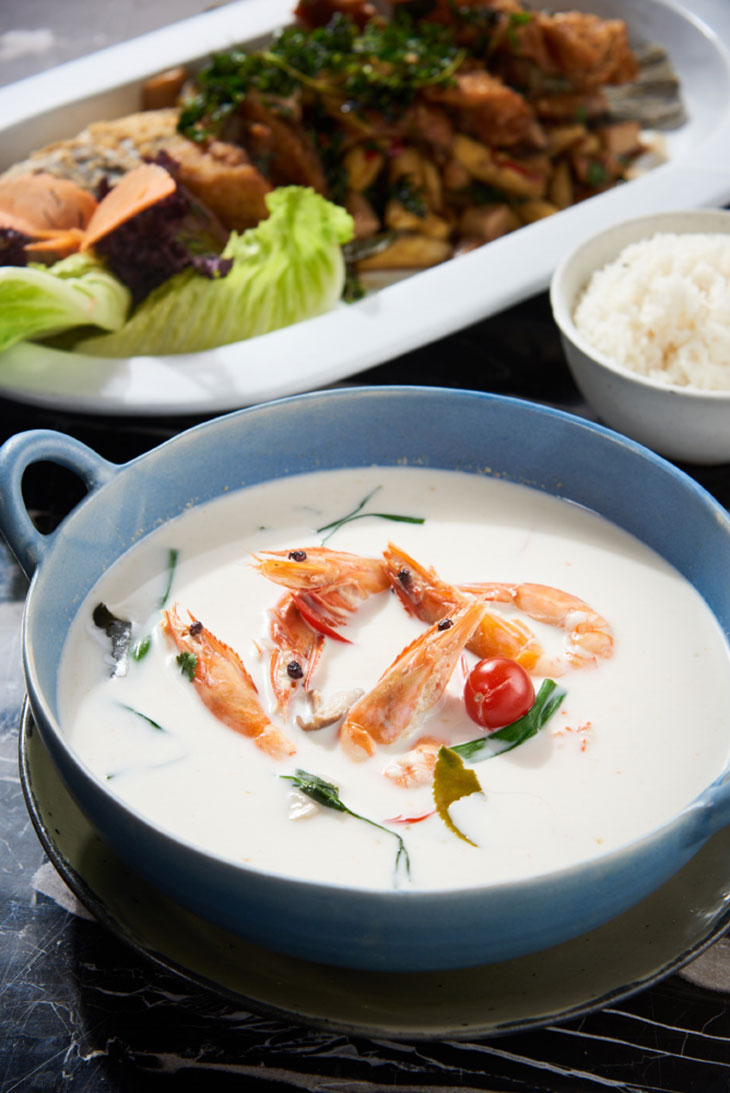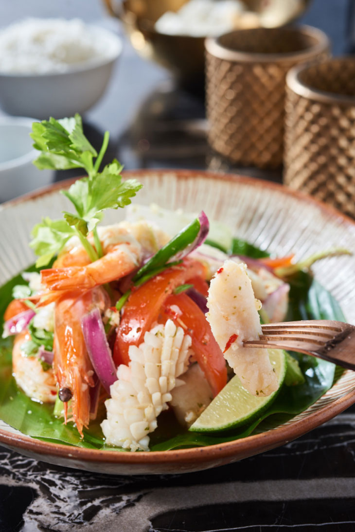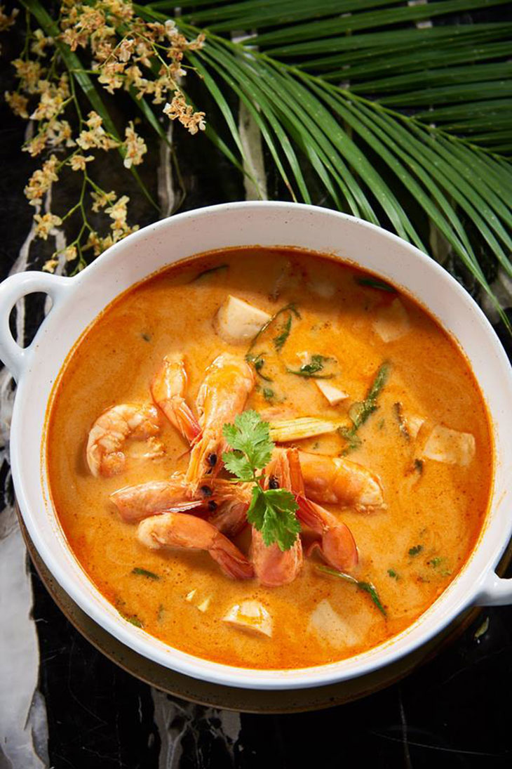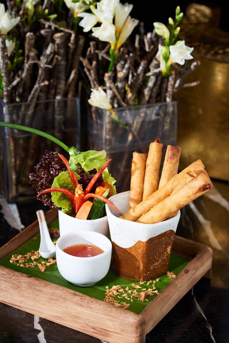 金黃酥脆的泰式鮮蝦炸春捲,用泰國傳統辛香料豬肉內餡加上鮮蝦,春捲皮包起油炸,配上泰式甜雞醬品嚐,酸甜滋味齒頰留香。