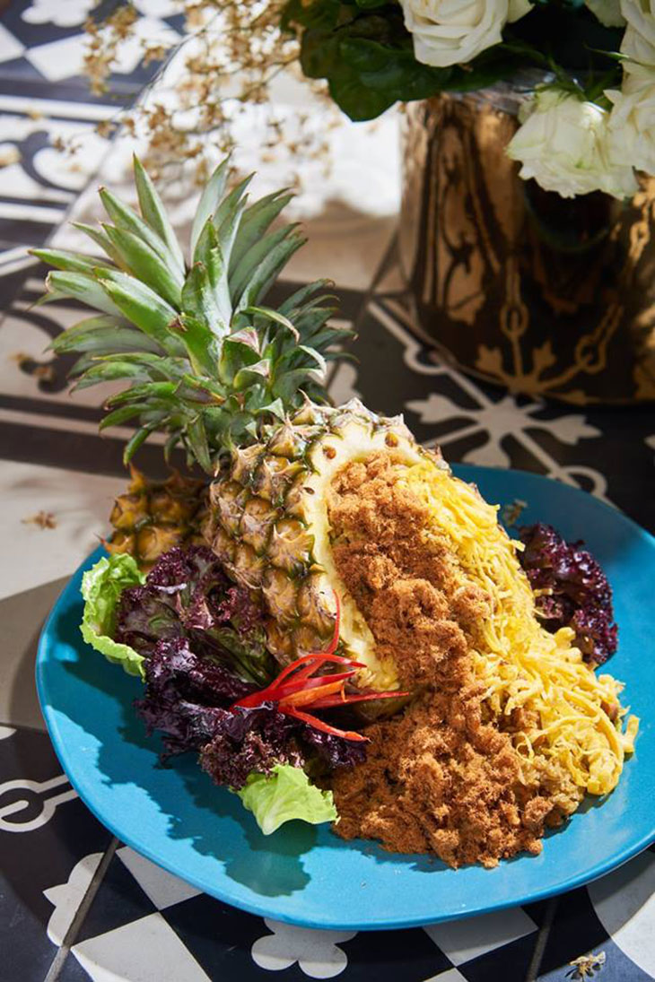 大器的直接使用半顆鳳梨入菜,搭配肉鬆和蛋絲炒飯,擺盤更豪氣直接使用鳳梨作碗。