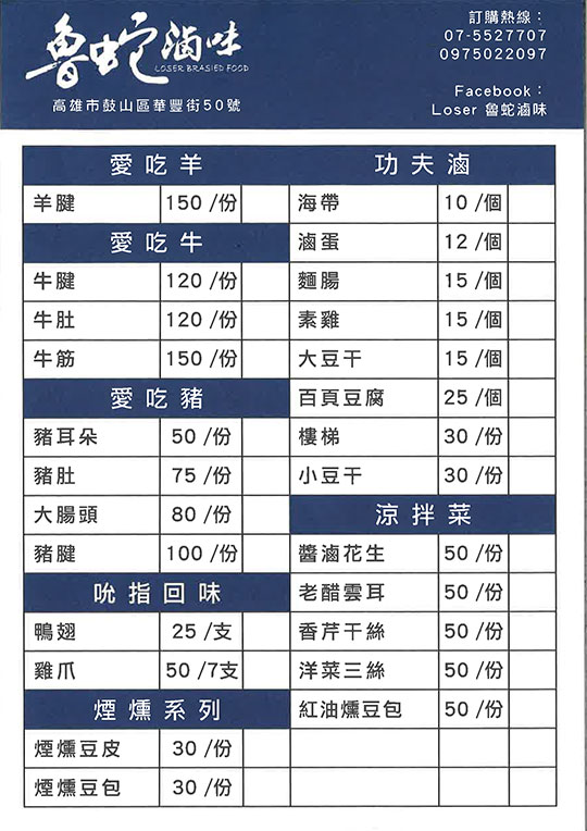 【魯蛇滷味】 魯蛇滷味鄰近明誠高中,位於高雄市鼓山區華豐街 50 號, 牛 腱 好嫩好嫩的新鮮牛腱,讓人吃過淚 ~牛~ 滿面。 牛 肚 豬 耳 朵 + 豬 腱 煙 燻 豆 包 醬 滷 花 生 滷得夠味的花生真的涮嘴到一個不行。一顆顆飽滿渾圓的滋味,紮實細緻,回味再三。