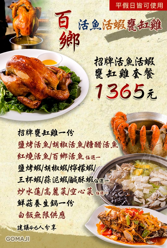 招牌甕缸雞一份 + 鹽烤活魚/胡椒活魚/糖醋活魚/紅燒活魚/百鄉活魚 任選一 + 鹽烤蝦/胡椒蝦/檸檬蝦/三杯蝦/蒜泥蝦/鹹酥蝦 任選一 + 炒水蓮/高麗菜/空心菜 任選一 + 鮮菇養生鍋一份 + 白飯無限供應